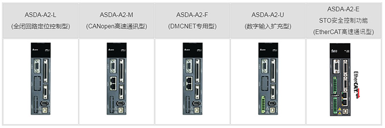 ASDA-A2系列共有五個(gè)機(jī)種:ASDA-A2-L, ASDA-A2-M, ASDA-A2-F, ASDA-A2-U, ASDA-A2-E