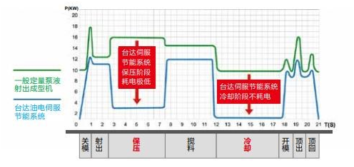 臺(tái)達(dá)油電伺服節(jié)能系統(tǒng),能精確控制整個(gè)注塑過程所需的壓力與流量,消除高壓節(jié)流的能源損耗,達(dá)到節(jié)能省電的效果,同時(shí)降低系統(tǒng)油溫,是一舉數(shù)得的系統(tǒng),節(jié)能率高達(dá)70%,平均節(jié)能率30%以上。