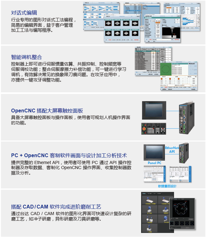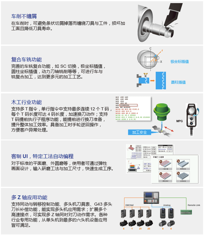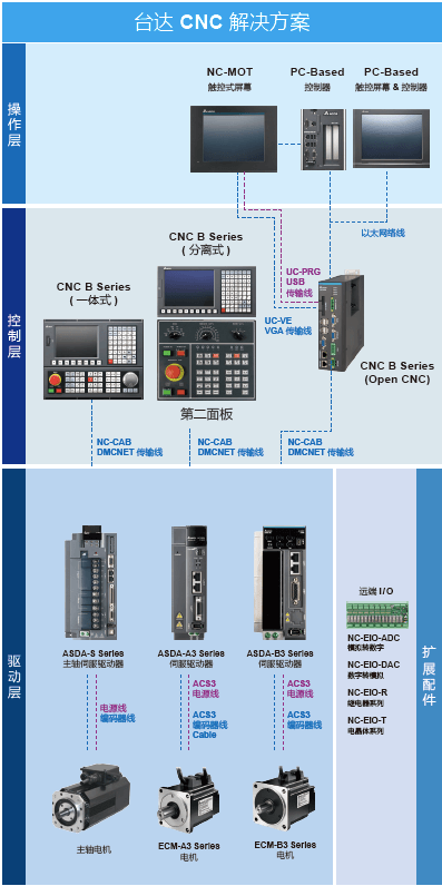 臺(tái)達(dá)新一代CNC B系列數(shù)控系統(tǒng),根據(jù)客戶(hù)需求和市場(chǎng)趨勢(shì),整合HMI 平臺(tái)操作界面,可依照企業(yè)及行業(yè)需求,彈性化客制操作界面;并可搭配臺(tái)達(dá)伺服驅(qū)動(dòng)器 ASDA-A3 / ASDA-B3 系列、永磁主軸系統(tǒng)及交流電機(jī)驅(qū)動(dòng)器驅(qū)動(dòng)主軸,以及通訊網(wǎng)絡(luò) DMCNET 等進(jìn)行高速數(shù)據(jù)傳輸及控制,達(dá)到控制機(jī)床的電機(jī)定速、定轉(zhuǎn)矩與精密定位。