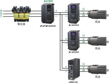 取代傳統(tǒng)動(dòng)態(tài)煞車電阻裝置。一般傳統(tǒng)交流變頻器驅(qū)動(dòng)馬達(dá)在運(yùn)動(dòng)瞬間或頻繁煞車時(shí),利用安裝高瓦數(shù)的煞車電阻來(lái)吸收過(guò)多的反饋能量,并轉(zhuǎn)成熱能散發(fā)。解決負(fù)載能量反饋但效率不佳,且增加硬件額外費(fèi)用與空間。使用AFE2000系列之后,負(fù)載反饋的能量不需要再轉(zhuǎn)換成熱能散發(fā)掉,相對(duì)的可以將反饋能量回饋到電網(wǎng),省電省錢而且環(huán)保,如下圖所示。