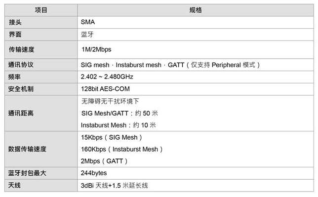 -IG Mesh: 標(biāo)準(zhǔn)藍(lán)牙Mesh協(xié)議,15Kbps傳輸速率,有效距離約50m